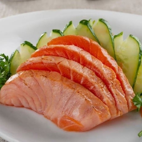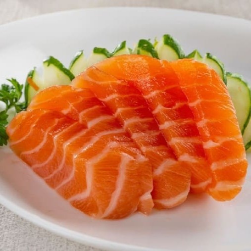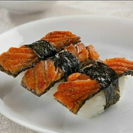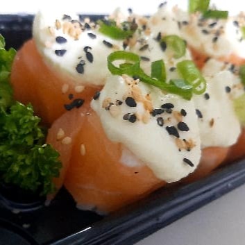 Fatias de salmão fresco e flambado. Por cima molho teriaki e gergelim