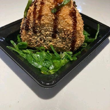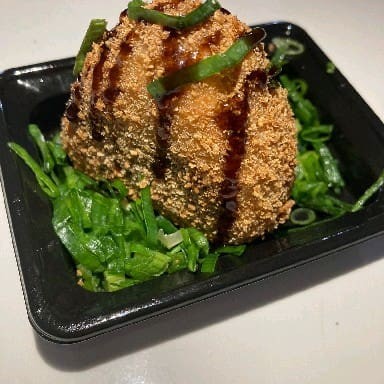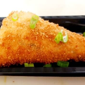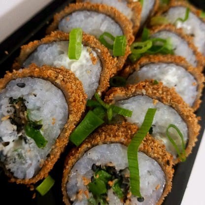 Roll com recheio de arroz, creme cheese, cebolinha, gergelim e empanado na panko