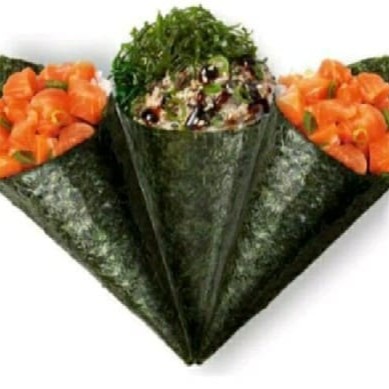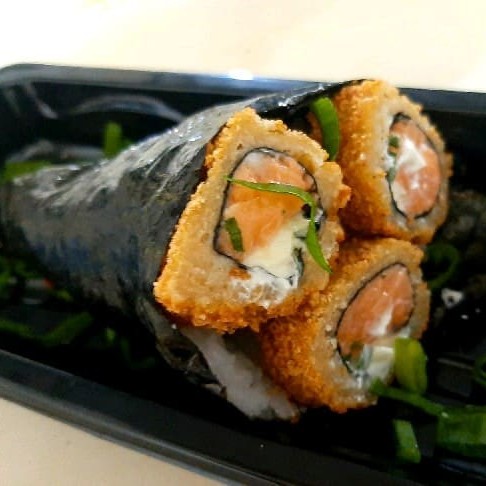 Temaki mix de salmão, creme cheese, cebolinha, arroz japonês temperado com hondashi enrolado na alga/nori e empanado