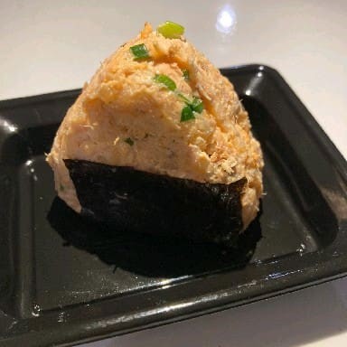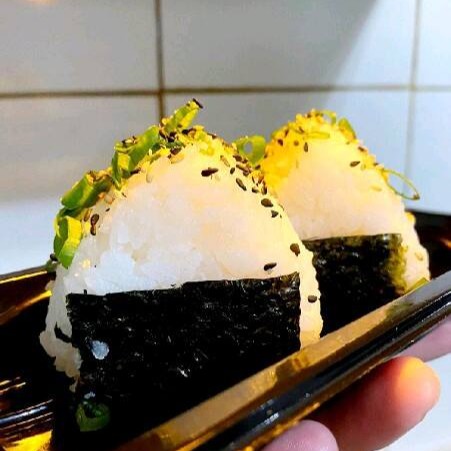 Dupla de oniguiri - o famoso bolinho de arroz japonês tradicional sobre o nori e também com cebolinha e gergelim. Acompanha molho teriyaki.
