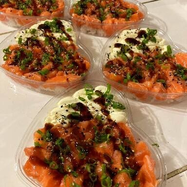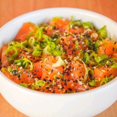 Salmão cortado em cubos, temperado com cebolinha e gergelim sobre uma leve camada de arroz japonês.