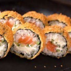 Apenas salmão, creme cheese e cebolinha são empanados e constituído de arroz japonês formando o recheio desse delicioso temaki hot tradicional