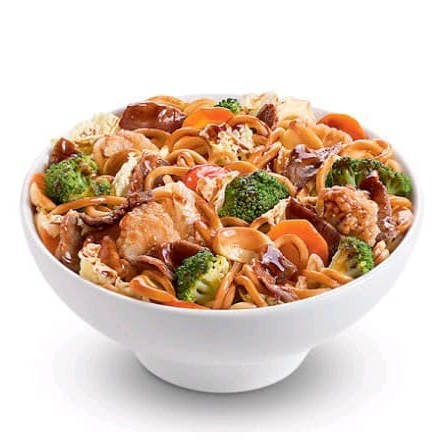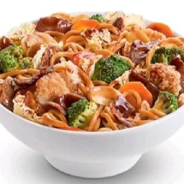 Macarrão, cebola refogada ao óleo de gergelim, cenoura, brócolis, repolho e proteínas de frango e carne.