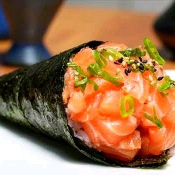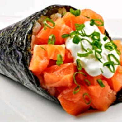 Temaki com recheio mix de salmão, creme cheese, cebolinha, arroz japonês e com tempero hondashi enrolado em uma deliciosa massa harumaki