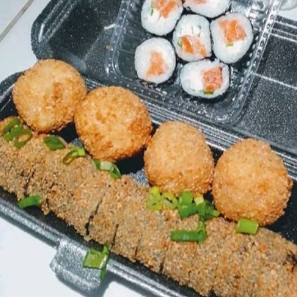 Bolinhos com recheio de salmão, creme cheese, cebolinha, arroz japonês e nosso tempero especial