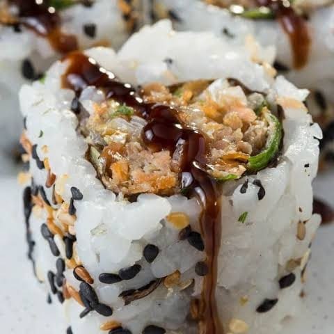 Recheio de salmão ou frango a sua escolha acompanhado de creme cheese, arroz japonês, cebolinha, gergelim e teriaki.