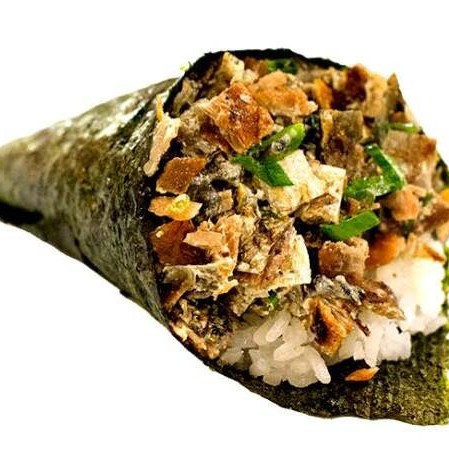 Cone com arroz, creme cheese, recheio de uma deliciosa pele de salmão grelhada no mix com teriaki, cebolinha e gergelim.