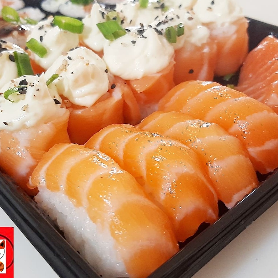8 sashimi salmão + 4 sushi de salmão + 4 sushi skin + 4 gunkas + 6 uramaki skin + 6 filadélfia + 12 hot filadélfia