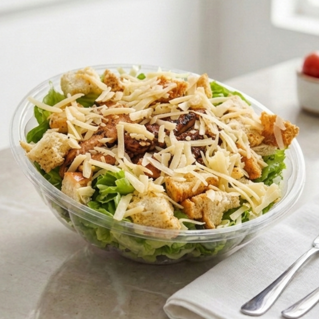 Mix de folhas frescas, tiras de frango grelhado, queijo ralado, croutons crocantes e molho Caesar cremoso.