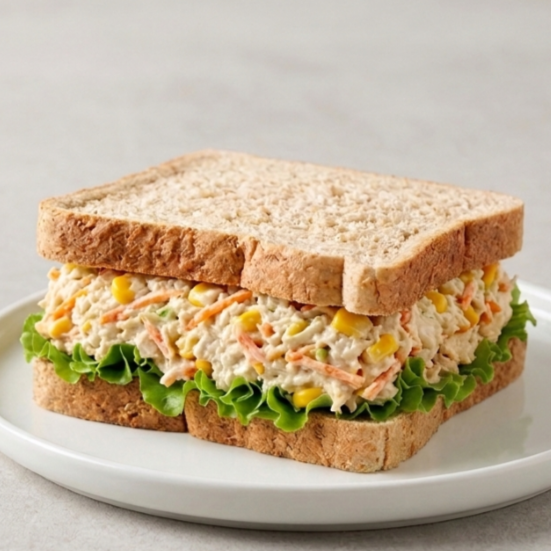 Pasta de Frango desfiado com cenoura e milho, alface e pão de forma.