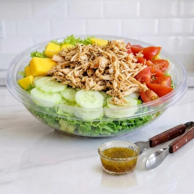 Uma deliciosa salada caesar com mix de folhas, tiras de filé de frango, queijo parmesão ralado e um molho caesar.