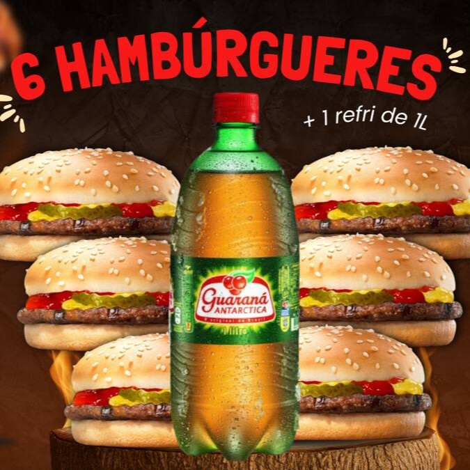 6 Hambúrgueres ( Pão, Carne, Salada, Ovo, Cheddar, Requeijão, Maionese de Alho e Batata Palha) + Batata (Bacon, Calabresa, Cheddar e Orégano) + 2l