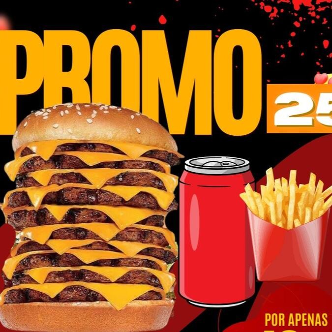 5 Hambúrgueres ( Pão, Carne, Salada, Ovo, Cheddar, Requeijão, Maionese de Alho e Batata Palha) + Batata (Bacon, Calabresa, Cheddar e Orégano) 2l