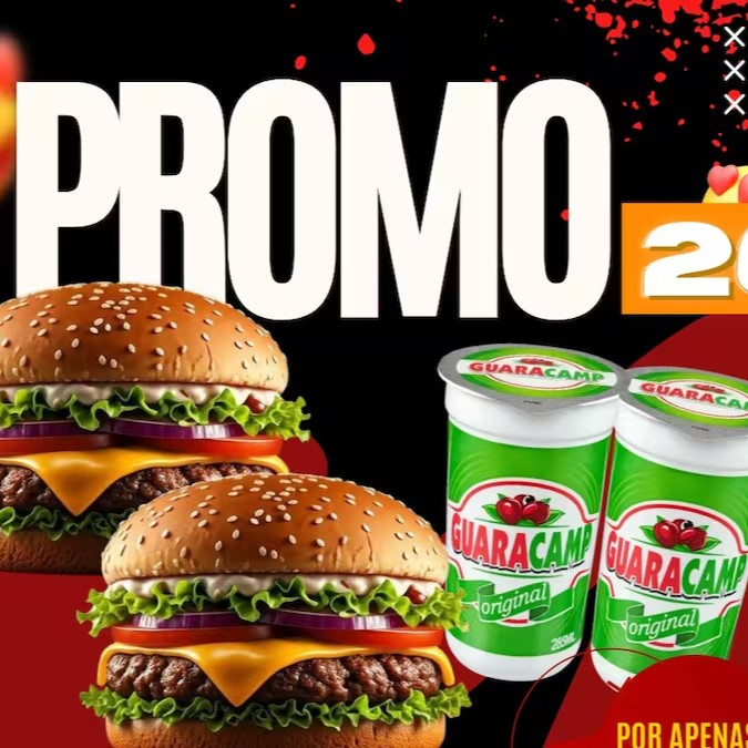 2 Hambúrgueres: Pão, 2 Carnes, Polenguinho, requeijão, maionese de alho, batata palha e Salada