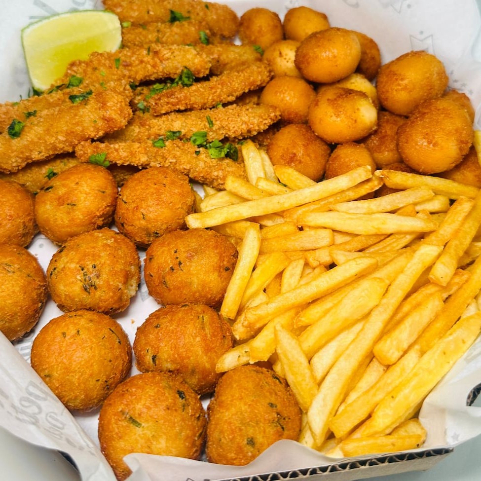 Delicie-se com o nosso incrível combo de petiscos! Saboreie batata frita crocante, bolinhos de bacalhau e salmão recheados com cream cheese e gurjões de peixe. Uma explosão de sabores e texturas para os amantes de frutos do mar. Aproveite esta experiência gastronômica única!