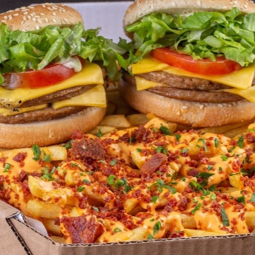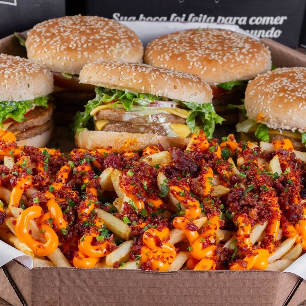 Dois hambúrgueres completos à sua escolha, mais batata frita com cheddar cremoso e farofa de bacon, finalizada com salsa fresca. 0,5kg (in natura, pesado antes do preparo)