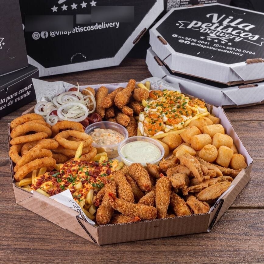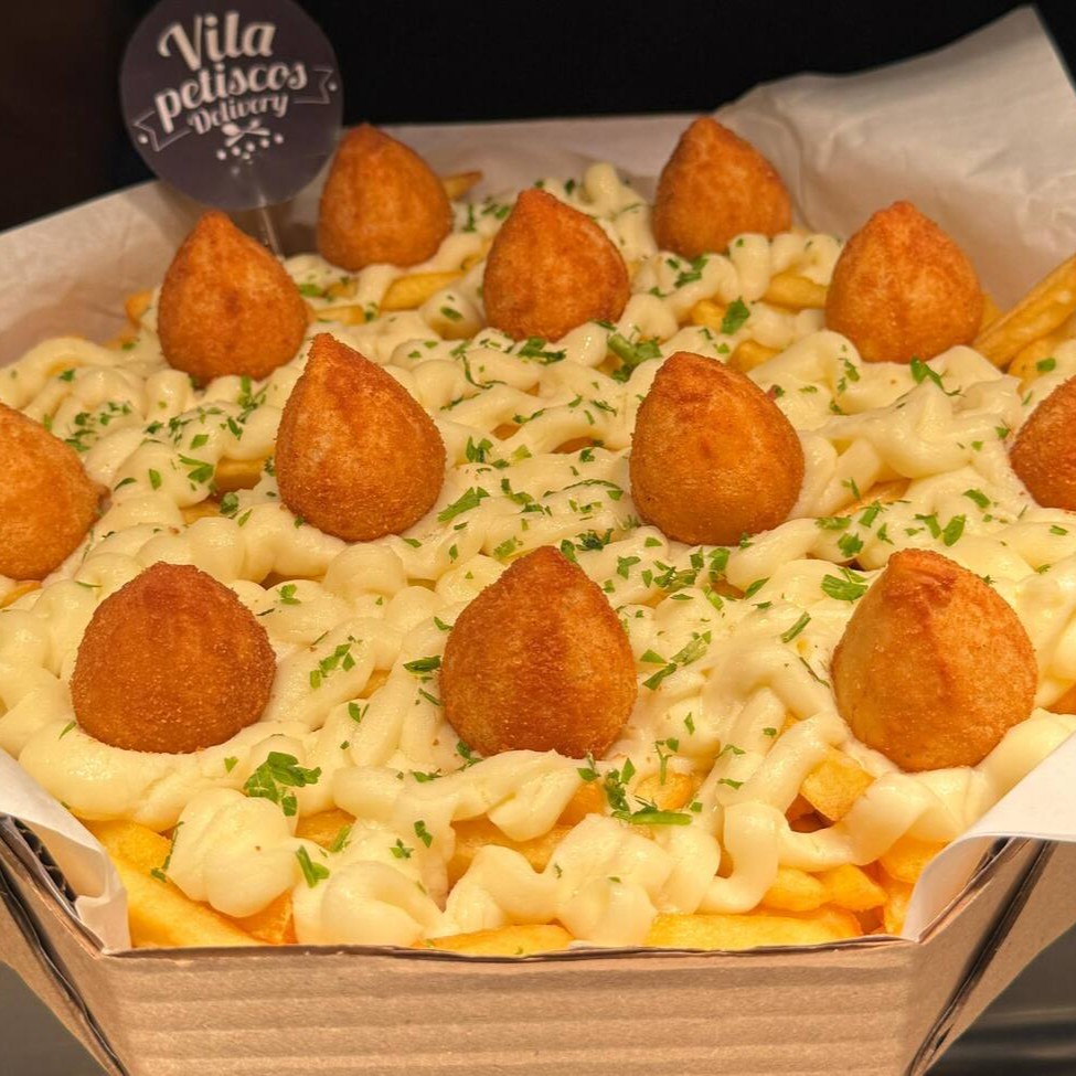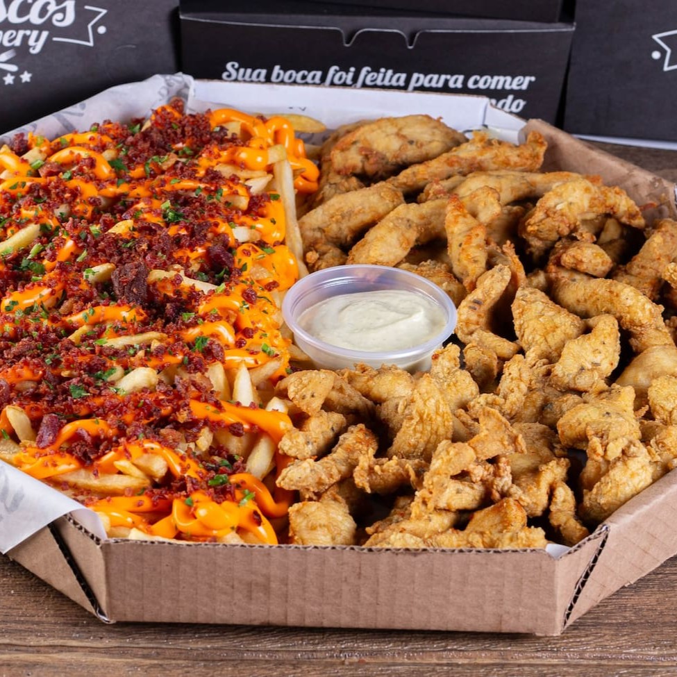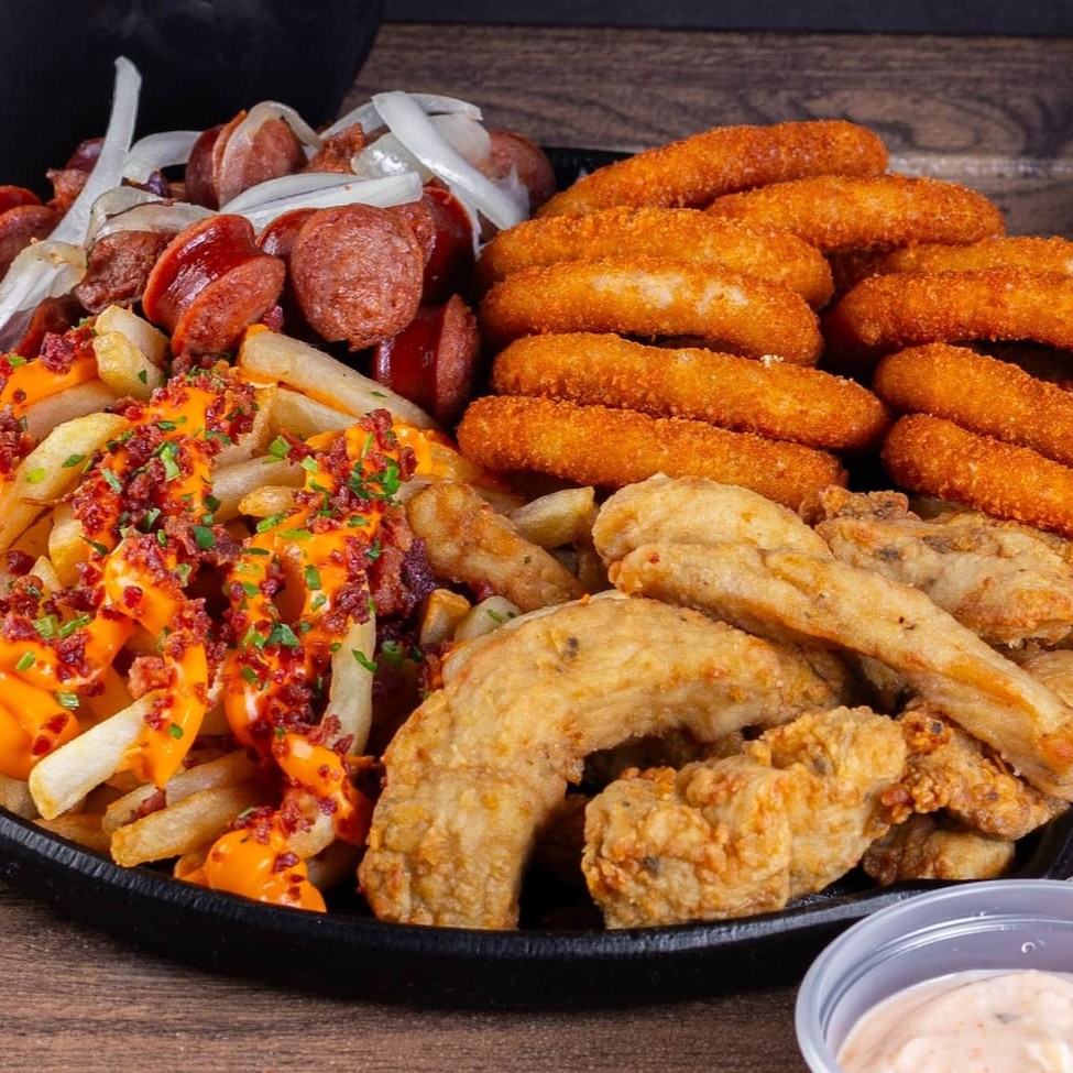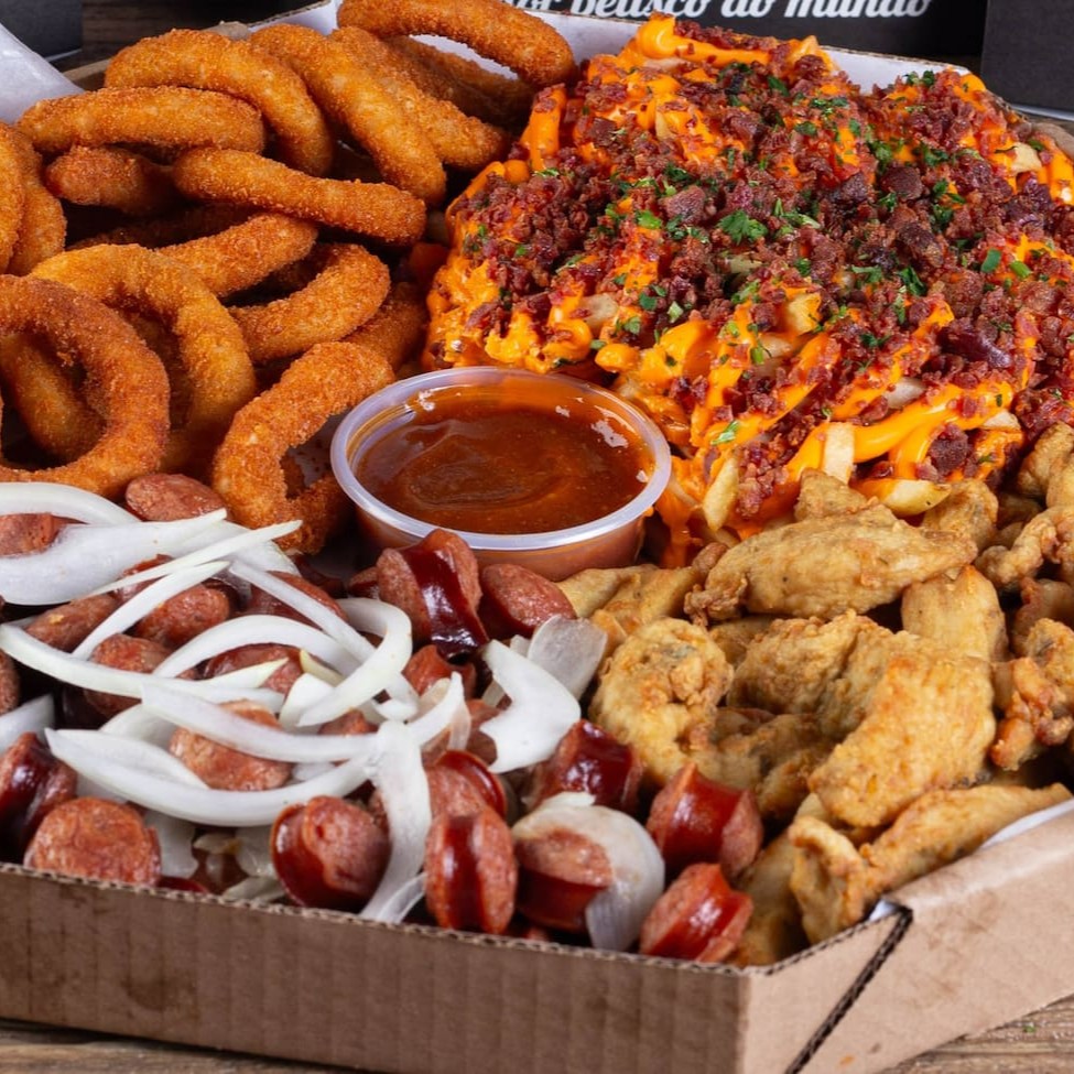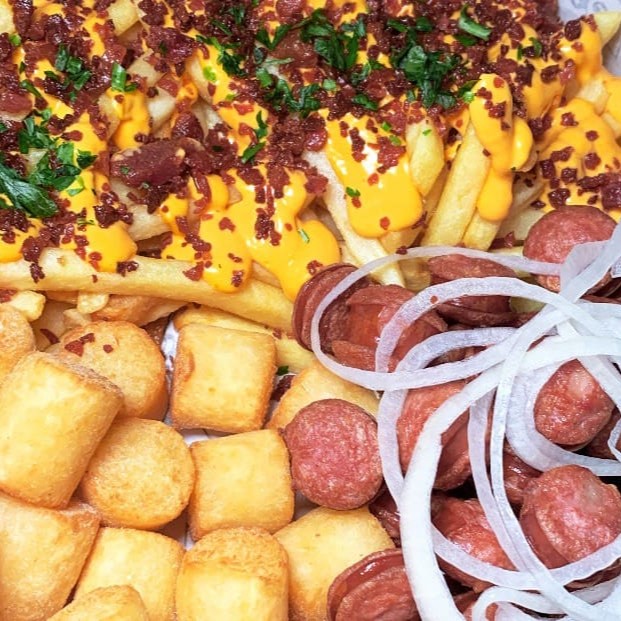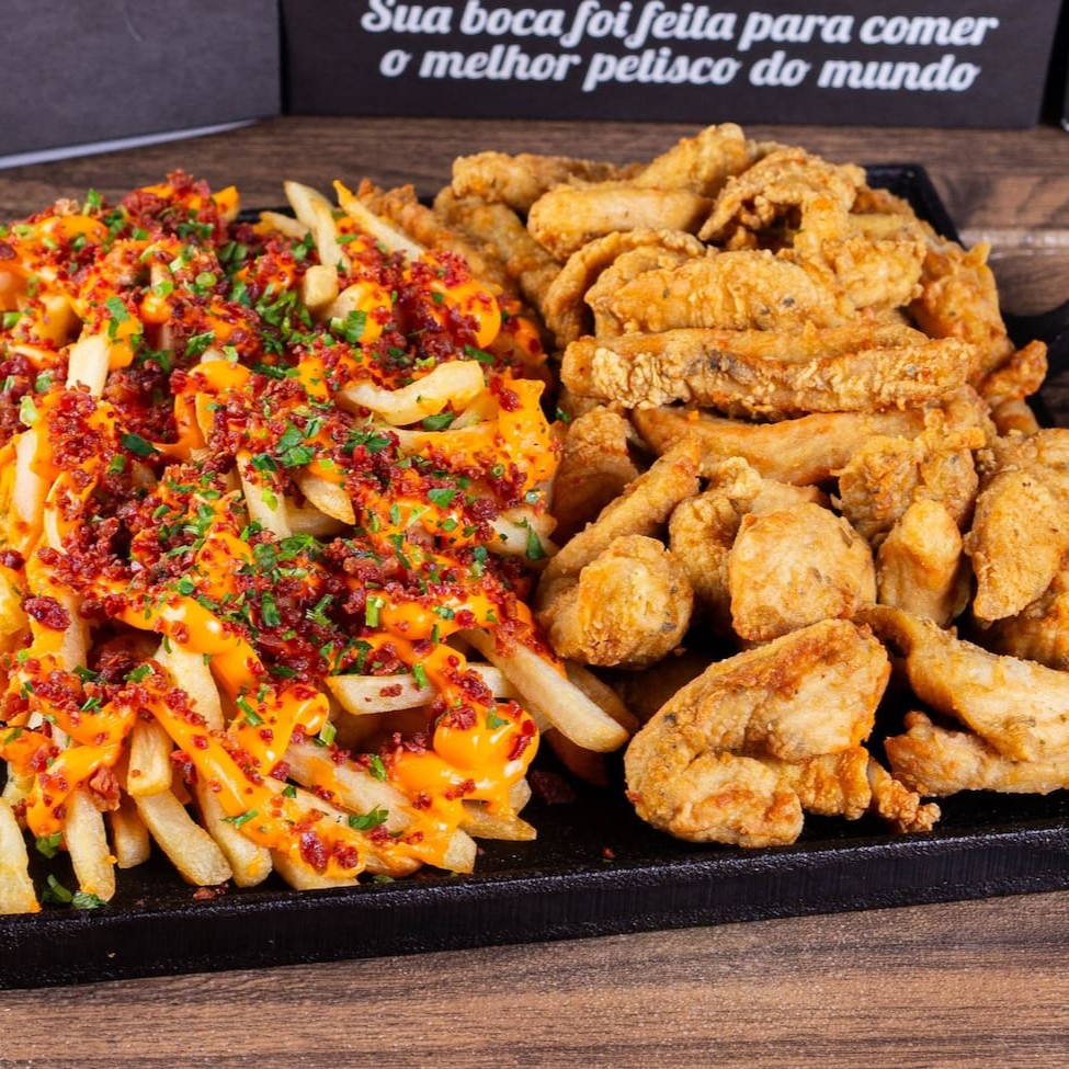 Batata com cheddar cremoso, farofa de bacon e finalizada com salsa fresca, gurjão de peixe crocante, bolinhos de bacalhau, linguiça fininha e acebolada, e almofadinhas de frango supreme. 1,5 kg ('in natura' pesado antes do preparo)