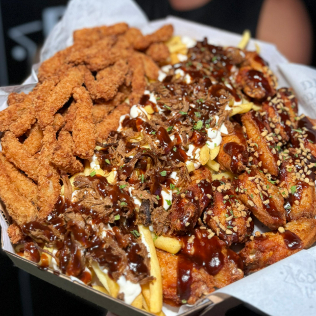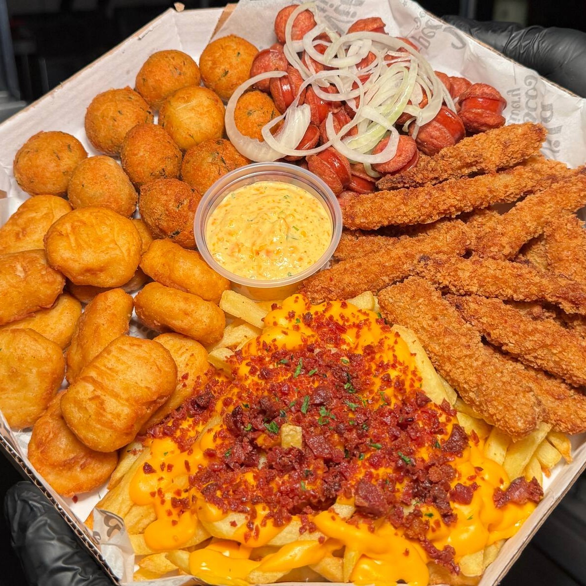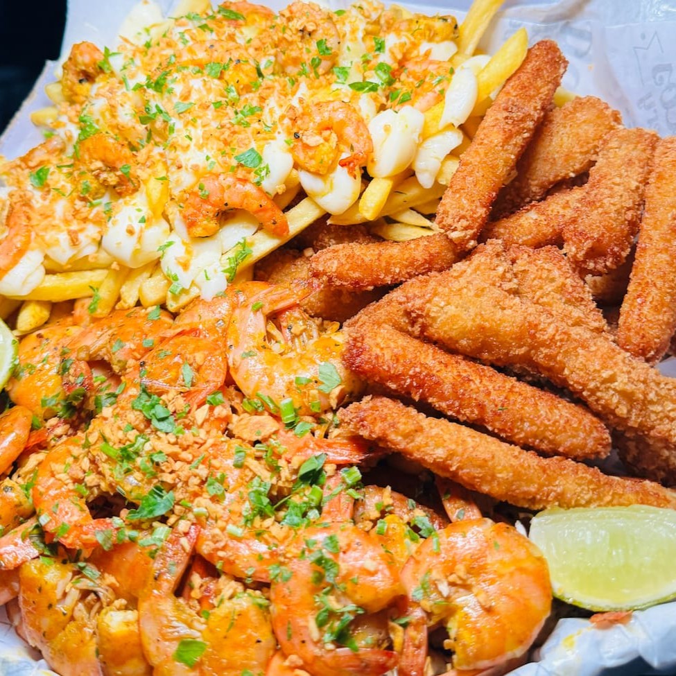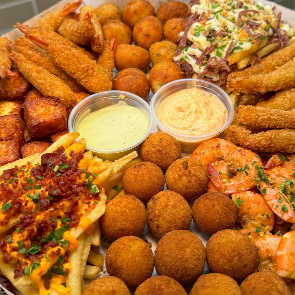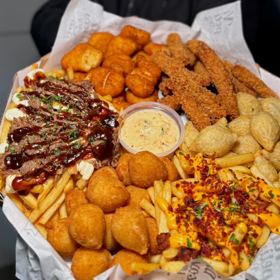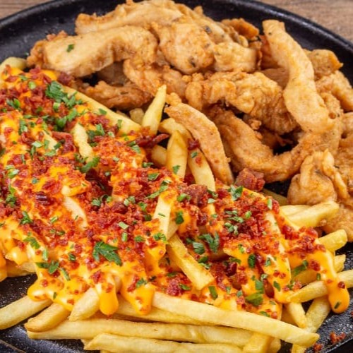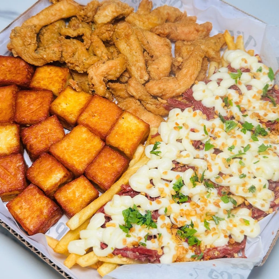 Batata com cheddar cremoso, farofa de bacon e finalizada com salsa fresca, gurjão de peixe crocante, bolinhos de bacalhau, linguiça fininha e acebolada, e almofadinhas de frango supreme. 1,5 kg ('in natura' pesado antes do preparo)