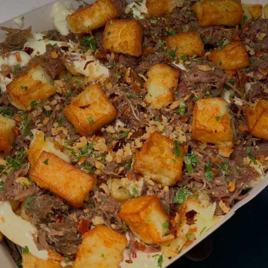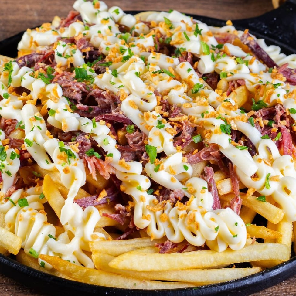 Porção de Batata Frita com cobertura cremosa de Cream Cheese Polenghi e uma generosa porção de Costela Bovina temperada. Por cima acompanha dadinhos de queijo coalho com alho frito, pimenta calabresa e cheiro verde.