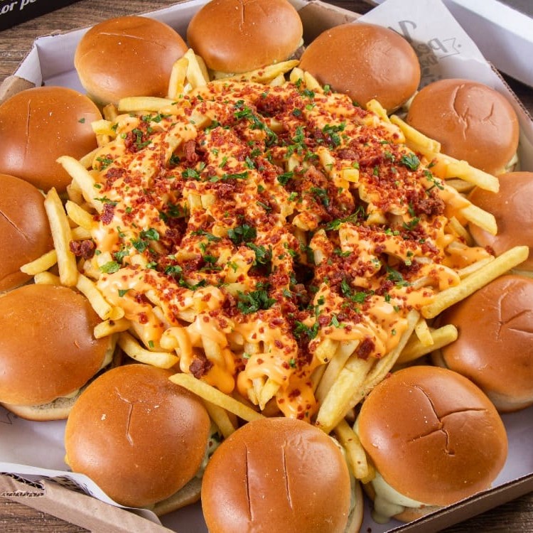 Um delicioso combo de 12 mini hambúrgueres suculentos, acompanhados por batatas cobertas com cheddar derretido e pedaços irresistíveis de bacon crocante. Para completar garantindo uma explosão de sabores que certamente deixará você com água na boca. Bon appétit!