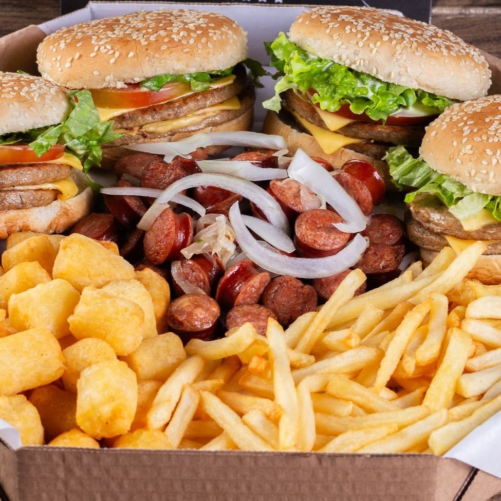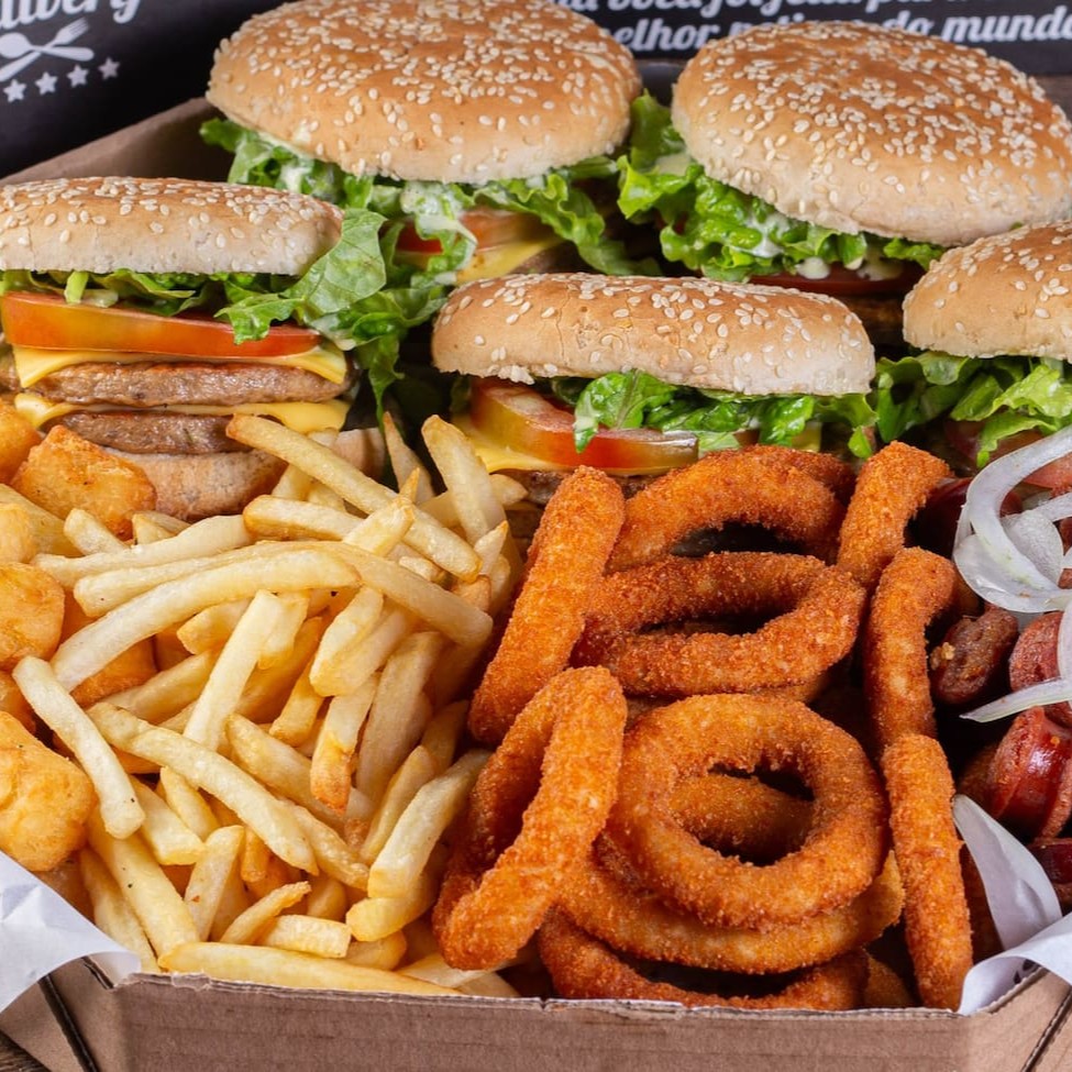 Cinco hambúrgueres completos à sua escolha, acompanhados de 4 porções diferentes. Batata frita, linguiça acebolada, aipim noisette e cebola empanada. Perfeito pra galera! 1,2kg (in natura, pesado antes do preparo)