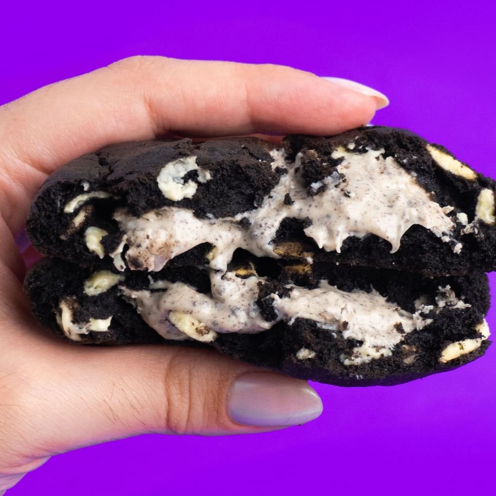 Cookie com massa de cacau black com gotas de chocolate branco e pedaços de biscoito Oreo, recheado com ganache de chocolate branco e pedaços de Oreo. Recomendamos esquentar 20 segundos no microondas ou 5 minutos no forno a 180graus para uma experiência ainda mais especial! Pesa aproximadamente 100g.