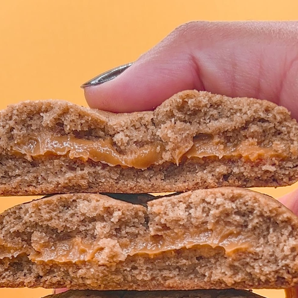 Nossa massa de baunilha com uma pitada de canela, recheado com doce de leite! Uma explosão de sabores, um churros em forma de cookie! Recomendamos esquentar 20 segundos no microondas ou 5 minutos no forno a 180graus para uma experiência ainda mais especial! Pesa aproximadamente 100g.