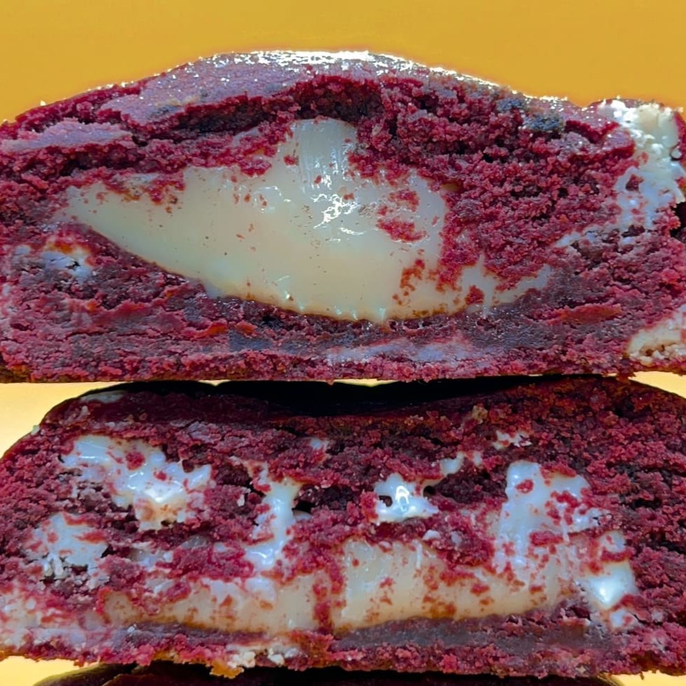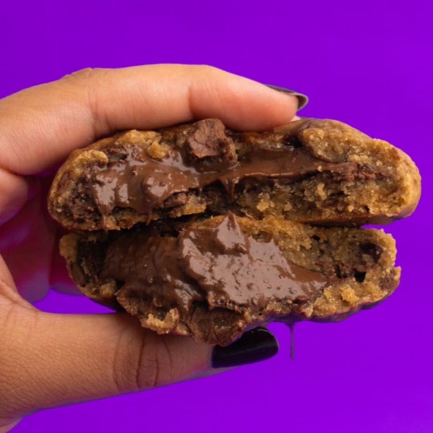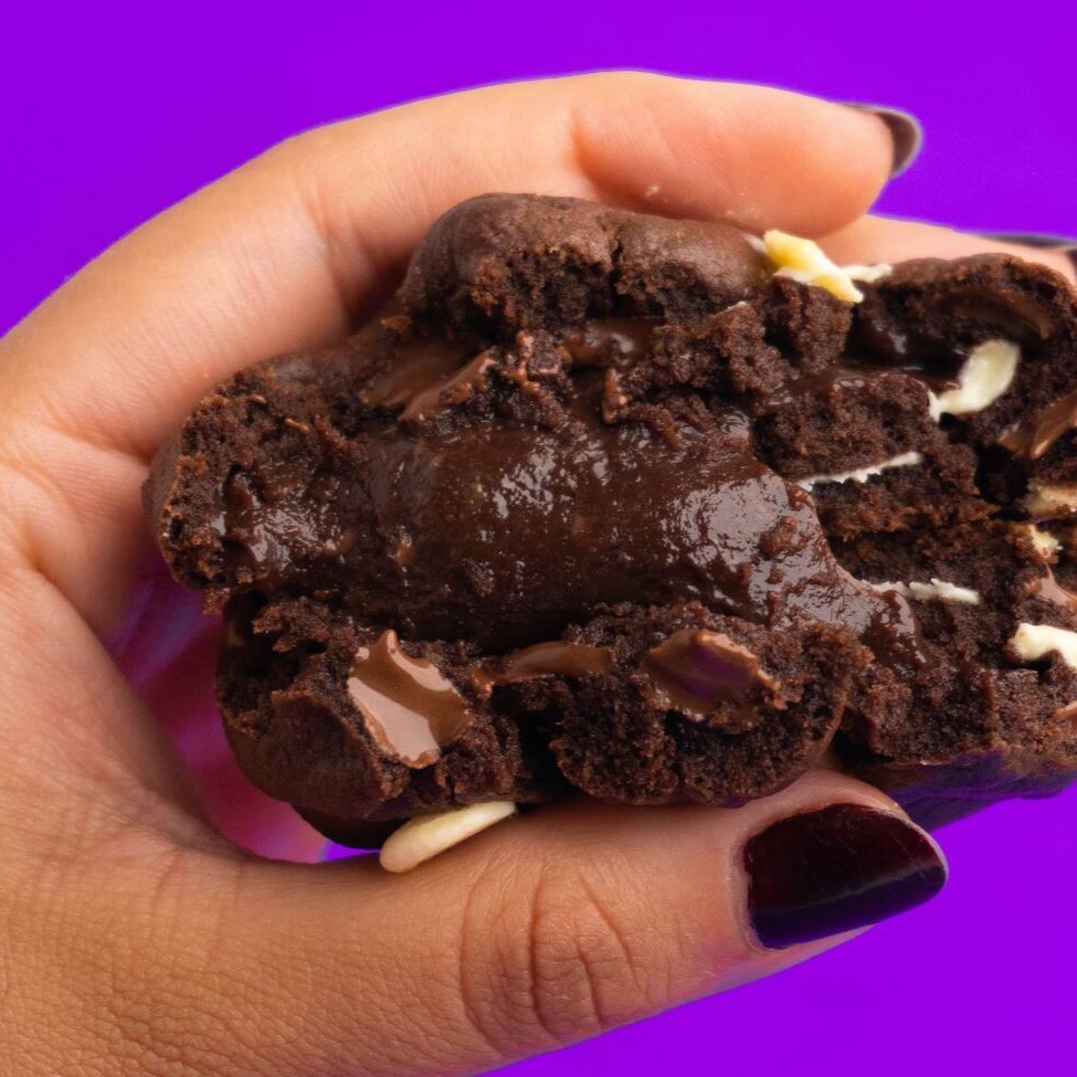 Massa maravilhosa de chocolate feita com cacau 100%, com gotas de chocolate branco e blend, recheado com um brigadeiro gourmet de chocolate. Sendo assim, uma Tripla explosão de chocolate. O cookie mais chocolatudo do muuundo!! Pesa aproximadamente 110g.