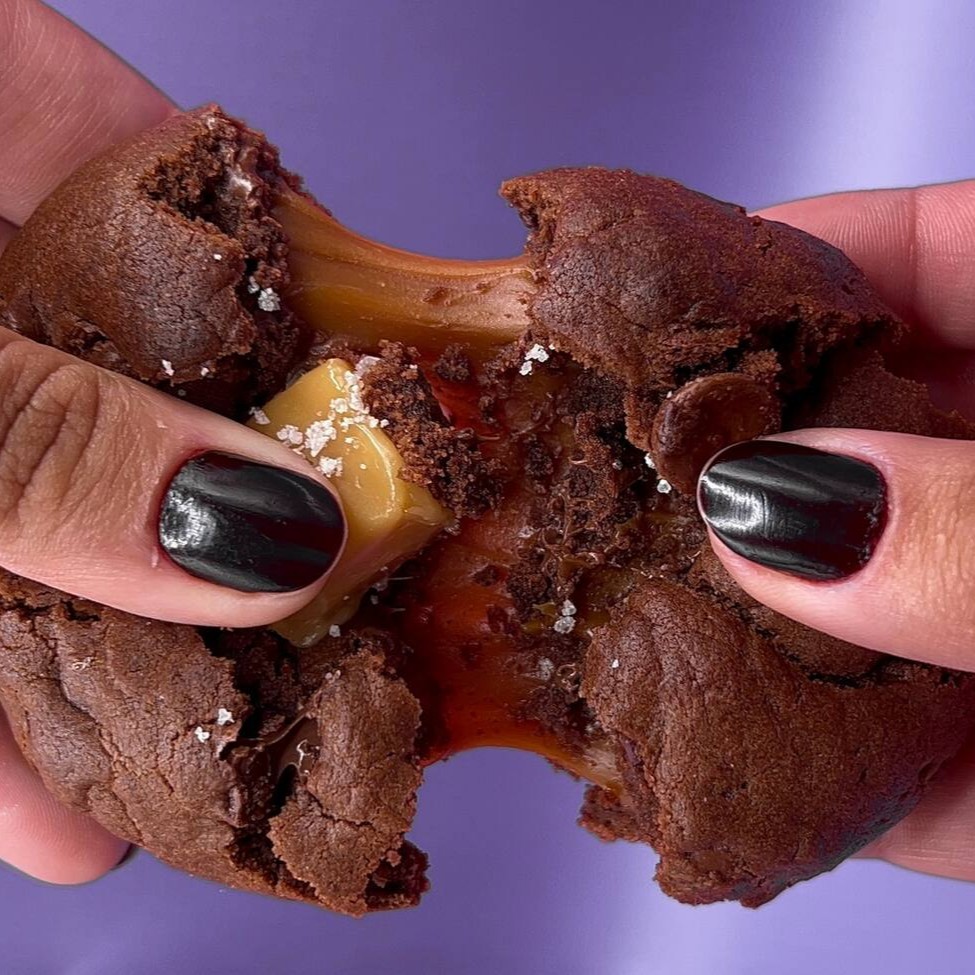 Massa maravilhosa de chocolate com blend de gotas de chocolate, recheado com um brigadeiro gourmet de caramelo salgado, finalizado com uma bala de caramelo e flor de sal