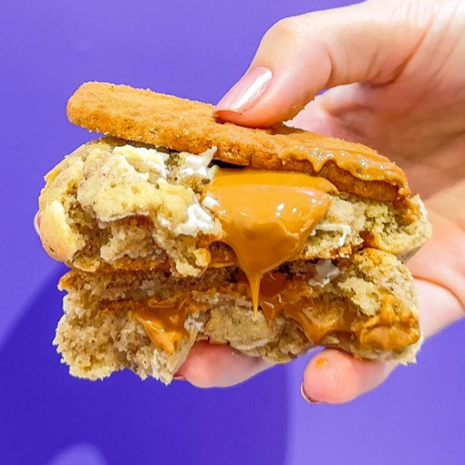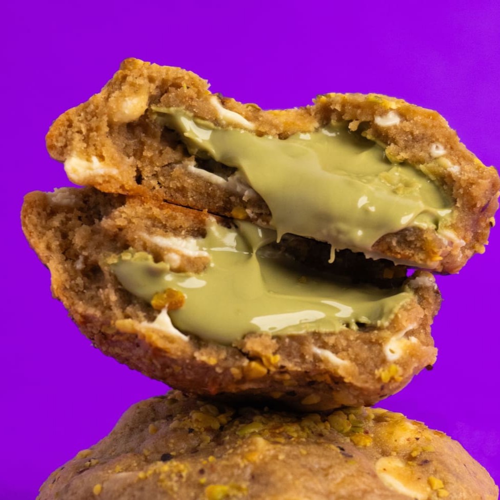Nosso queridinho cookie de pistache, feito com massa Tradiconal super crocante por fora e úmida por dentro, com gotas de chocolate branco nobre, recheado com nosso creme de pistache, finalizado com pedaços de pistache por cima.
