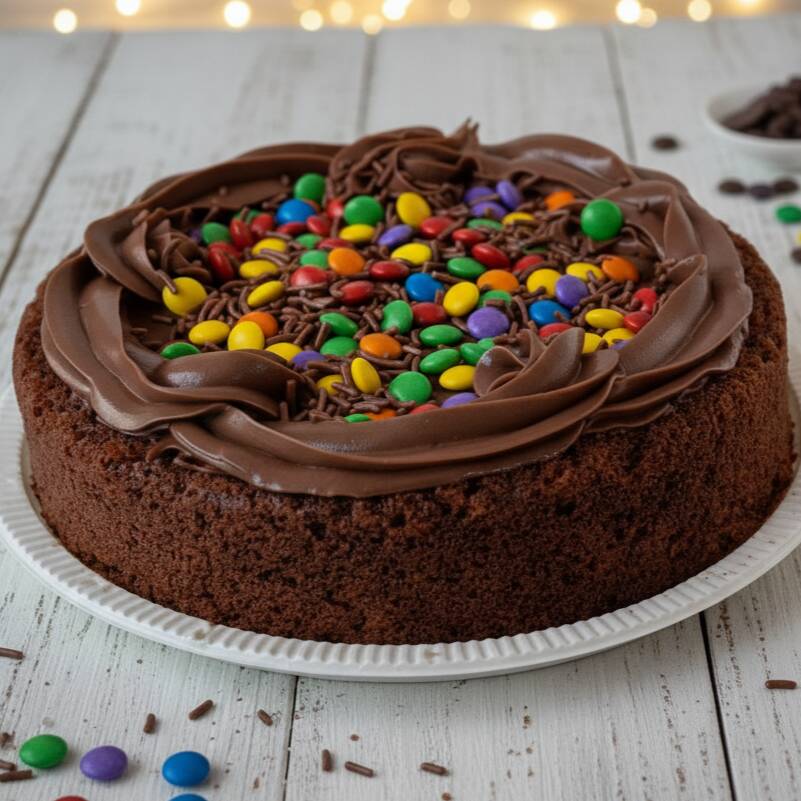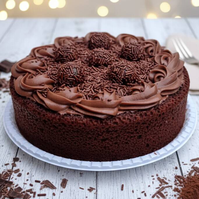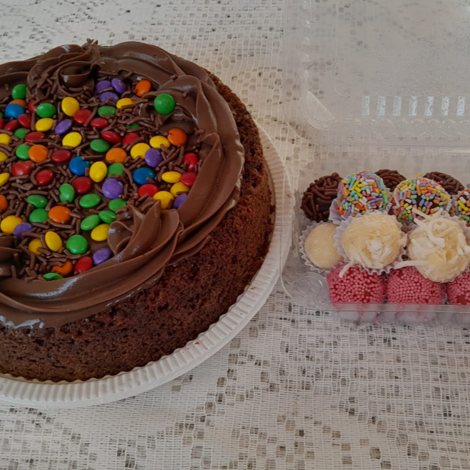 Nosso delicioso bolo caseiro de Chocolate com brigadeiro. Um bolo super macio e molhadinho de chocolate com um recheio piscininha de chocolate cremoso e decorado com docinhos.