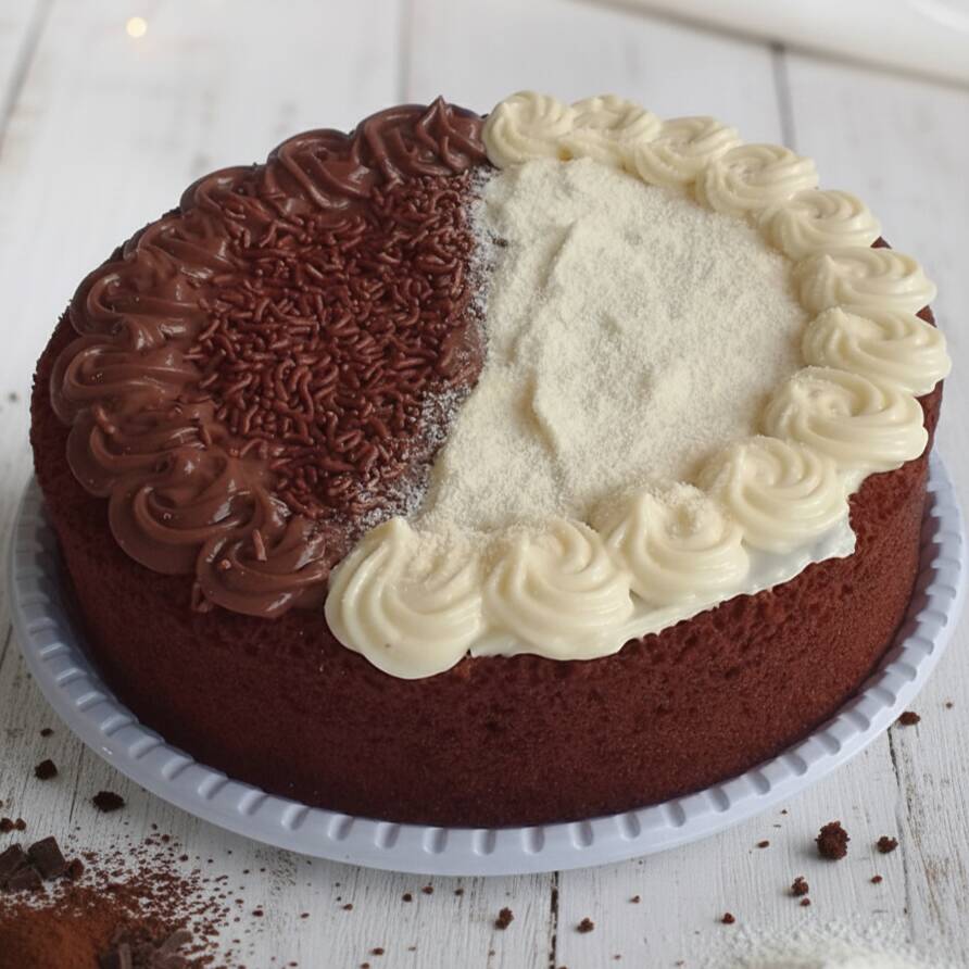 Uma deliciosa combinação meio a meio de brigadeiro cremoso com Ninho! Bolo de chocolate com uma massa fofinha e caseira com cobertura choconinho, decorado com chocolate. Peso aprox. Do bolo: 1kg. Serve de 6 a 8 fatias