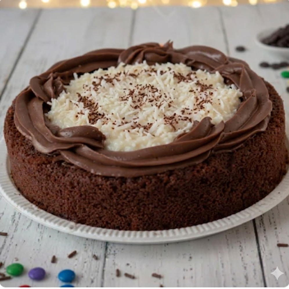 Um bolo de chocolate fofinho com um delicioso recheio piscininha de beijinho decorado com brigadeiro cremoso e coco ralado. Peso aprox. Do bolo: 1kg