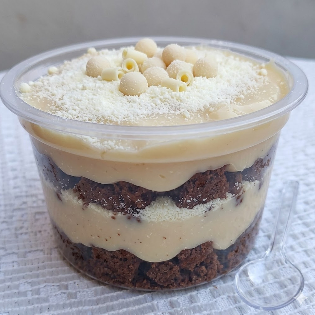 Delicioso bolo de chocolate no pote com recheio de coco e com coco ralado de toppin. A combinação tradicional Prestígio com bolo bem molhadinho. Peso aprox. Do doce: 250g