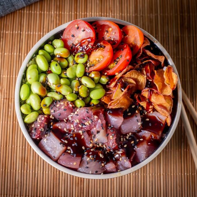 Base de Arroz Gohan, Atum, Edamame, Tomate Cereja, Chips de Batata Doce com Gergelim crocante