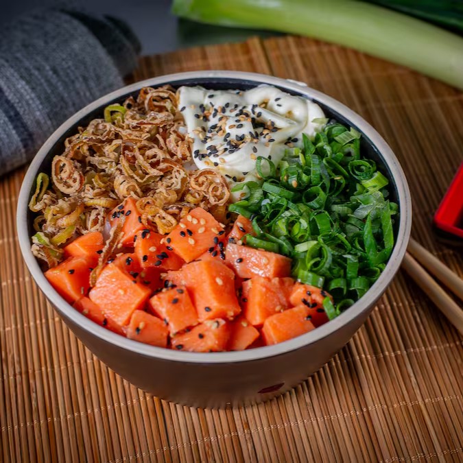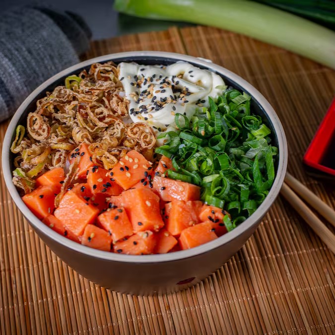 Base Arroz Gohan + Salmão em cubos com molho Teriyaki, Alho Poró Crispy, Cream Cheese, Cebolinha. Finalizado com cebolinha e Molho Shoyu Light
