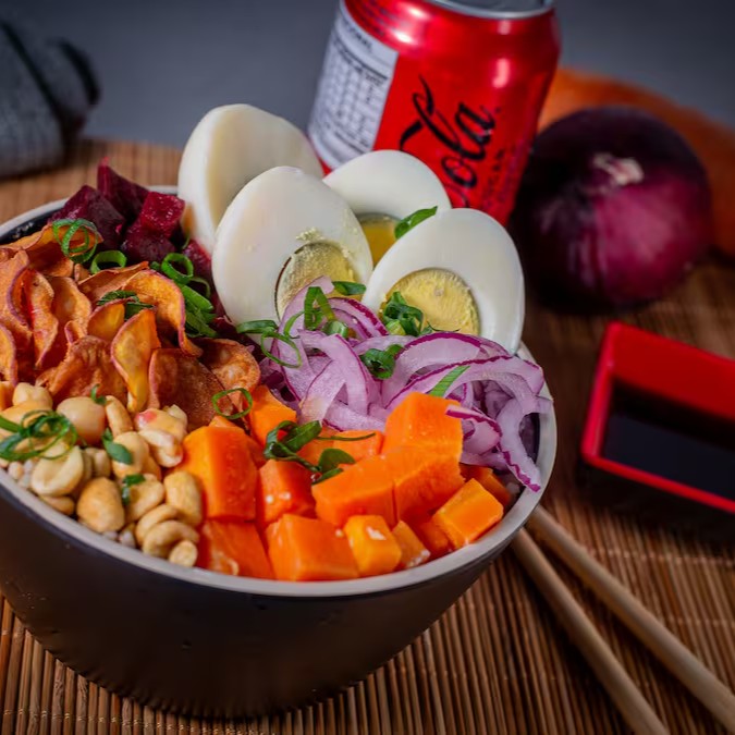Base à sua escolha: Arroz Gohan, Mix de Folhas ou Arroz integral. Proteína 2 ovos cozidos, cebola roxa, cenoura cozida, beterraba cozida, amendoim sem pele e sem sal, chips de batata doce crocante e finalizado com cebolinha. Escolha sua bebida Grátis
