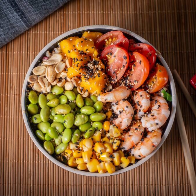 Base Arroz Gohan + Camarão, Edamame, amendoim crocante sem pele e sem sal, milho, tomate cereja e manga em cubos. Finalizado com Gergelim torrado.