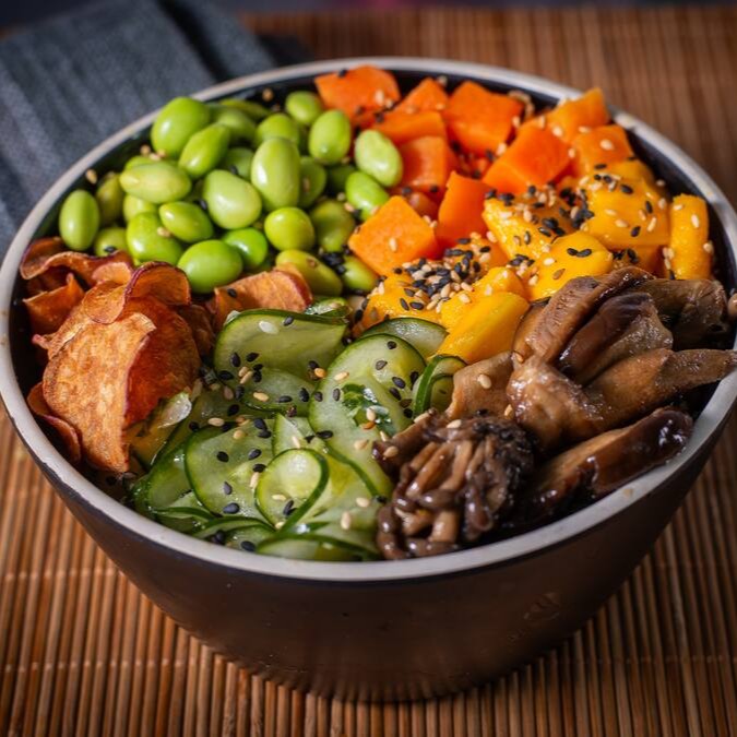 Escolha a sua Base + Mix de Cogumelos (Shitake + Shimej) Marinados no Shoyu com oléo de gergelim, Manga, Chips de Batata Doce, Sunomono, Cenoura Cozida e Edamame. Finalizado com Gergelim.