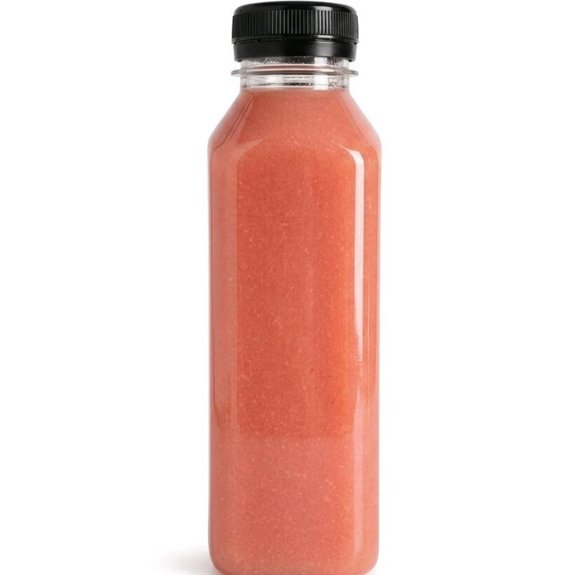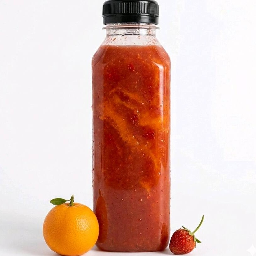 Polpa de morango, laranja, água e açúcar ou adoçante.
