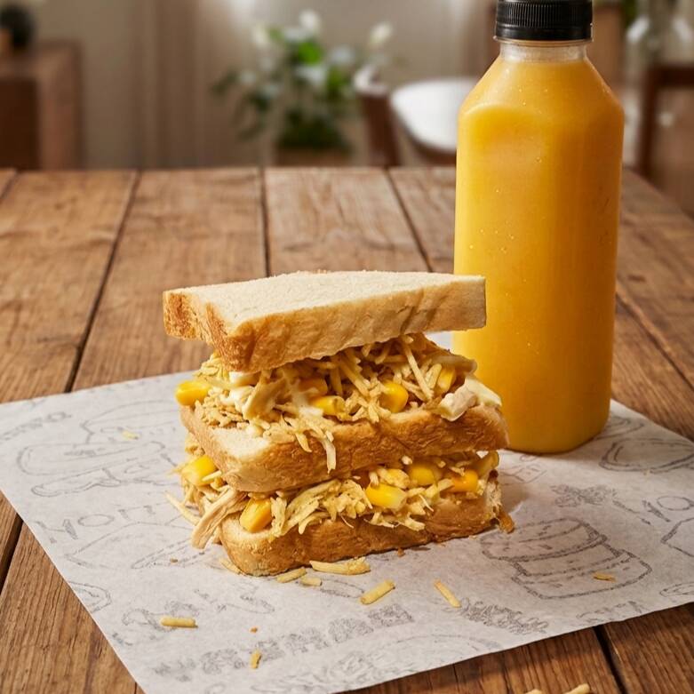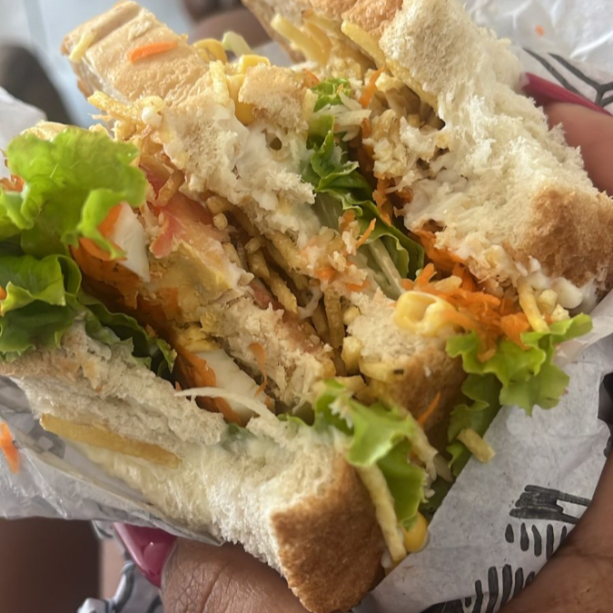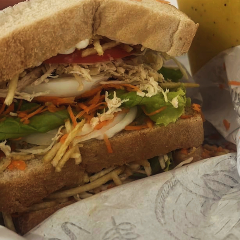 Um sanduíche Triplex (frango c requeijão ou maionese comum) + Um suco artesanal da sua preferência.