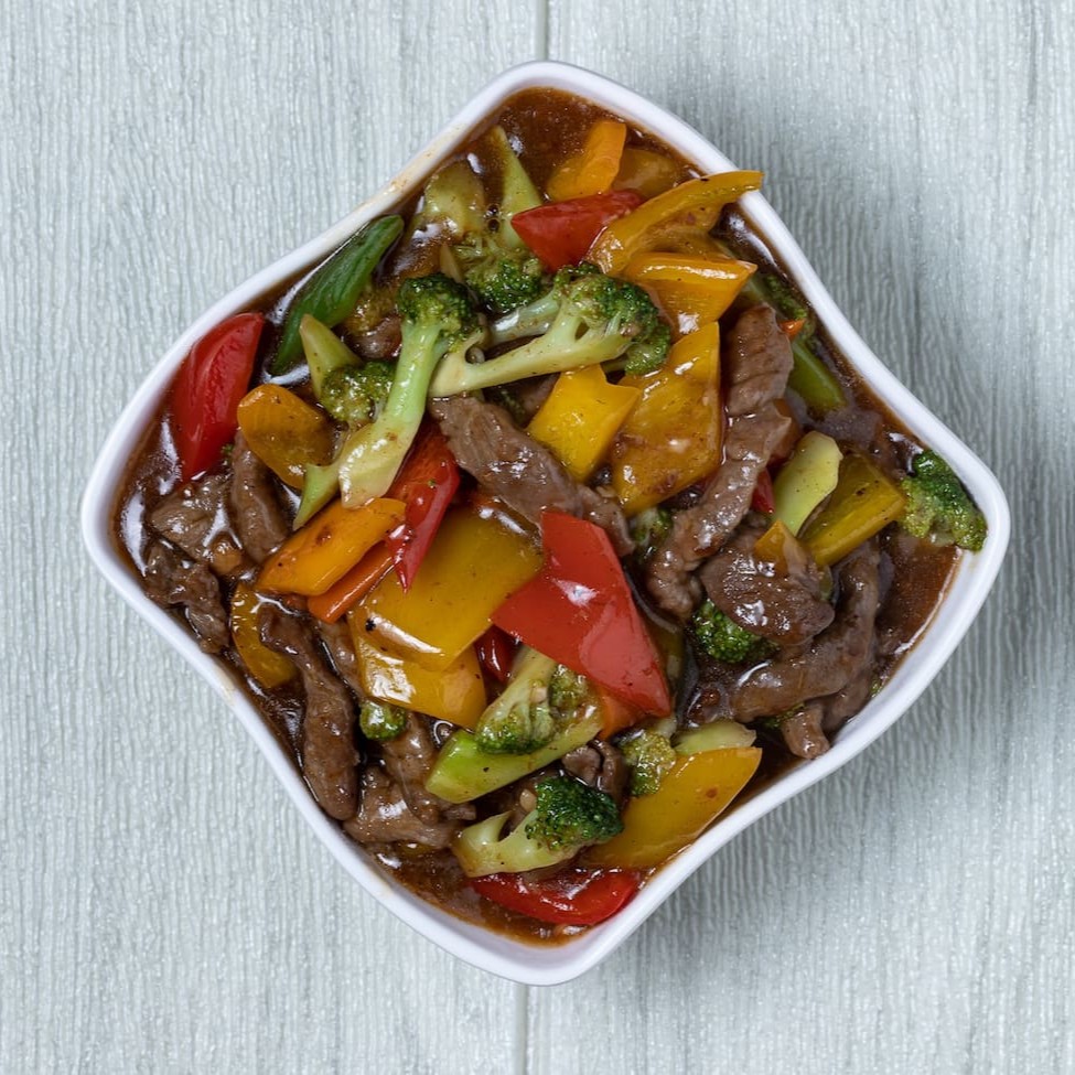 Fatias de carne com legumes e nosso surpreendente molho oriental + acompanhamento a sua escolha Peso: (Aprox 500g)
