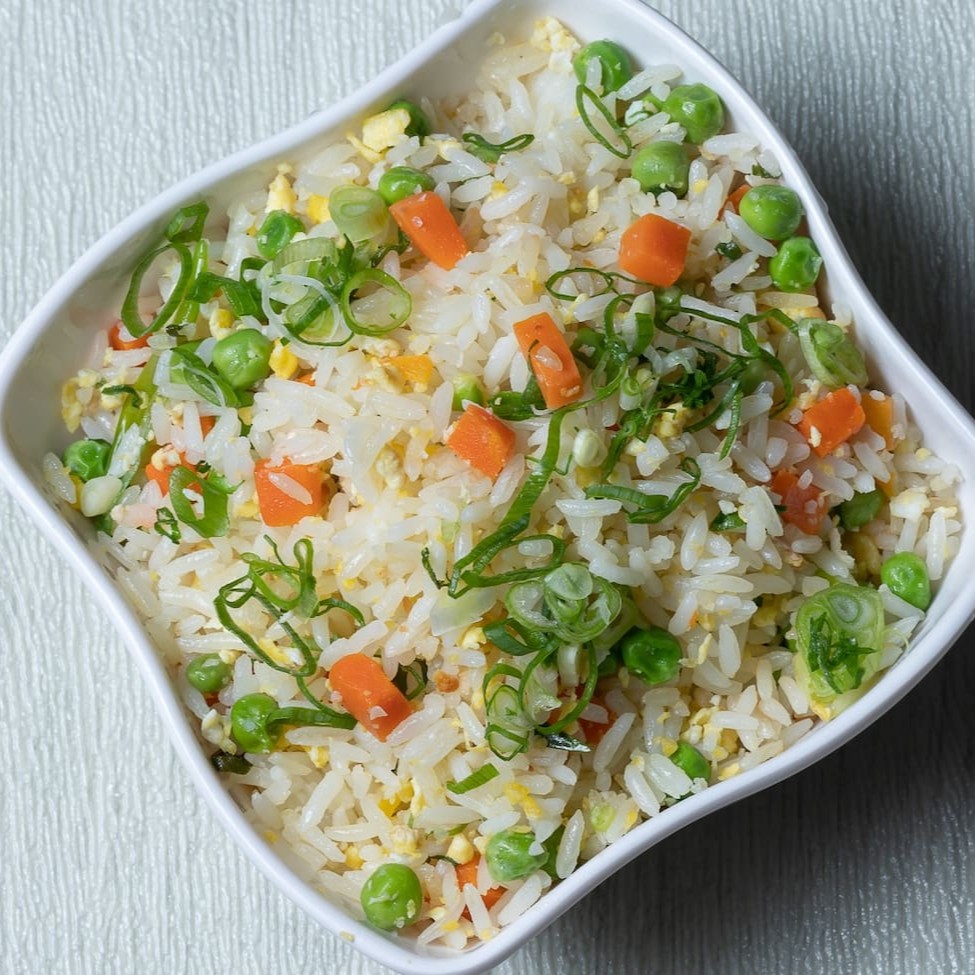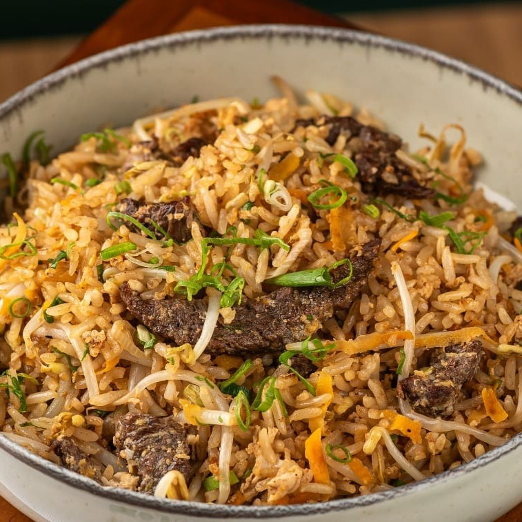 Arroz colorido com cenoura, cebolinha, ervilha, broto de feijão e ovo, salteados na Wok com uma proteína a sua escolha