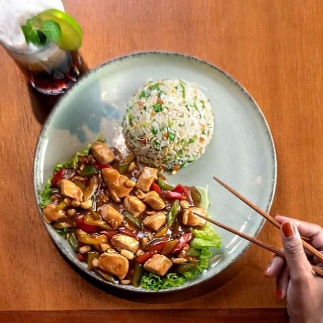 Arroz colorido com cenoura, cebolinha, ervilha, broto de feijão e ovo, salteados na Wok com frango.