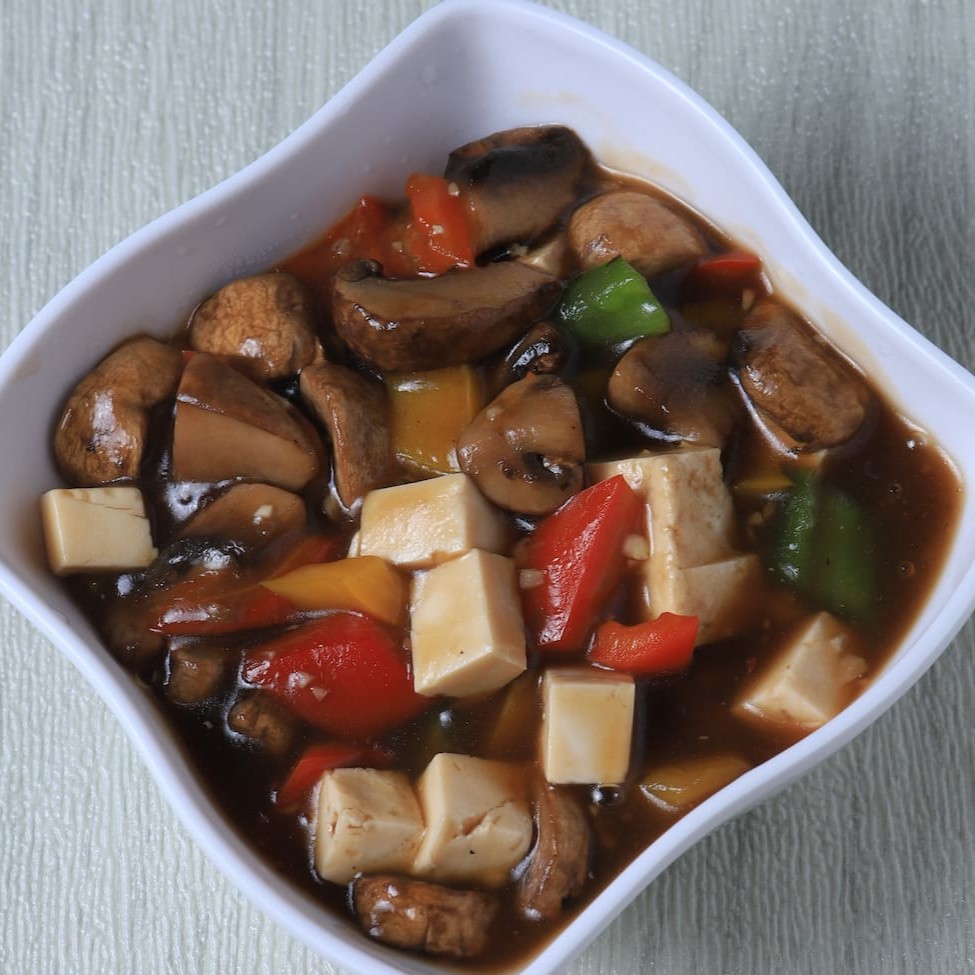 Cogumelo paris e tofu com o delicioso molho xadrez. Peso: (Aproximadamente 250g)