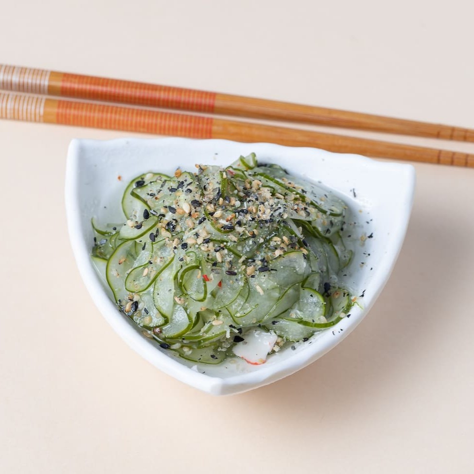 Salada de pepino agridoce, com kani ou sem.