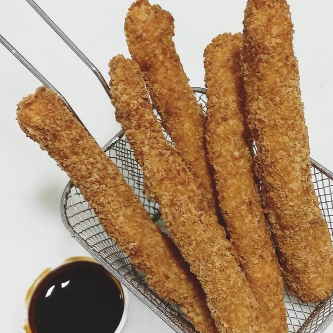 Salmao cortado em tiras, empanado e frito.