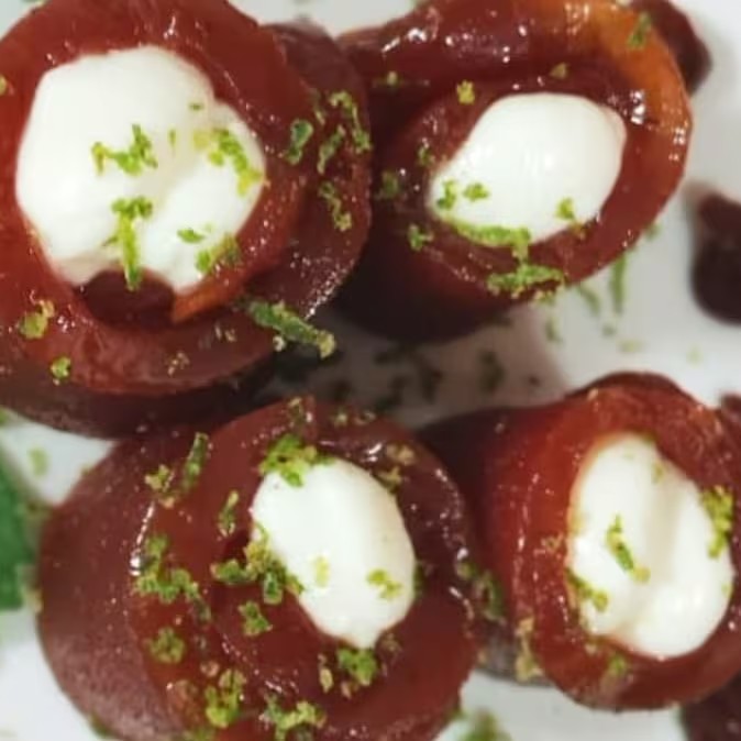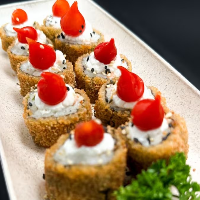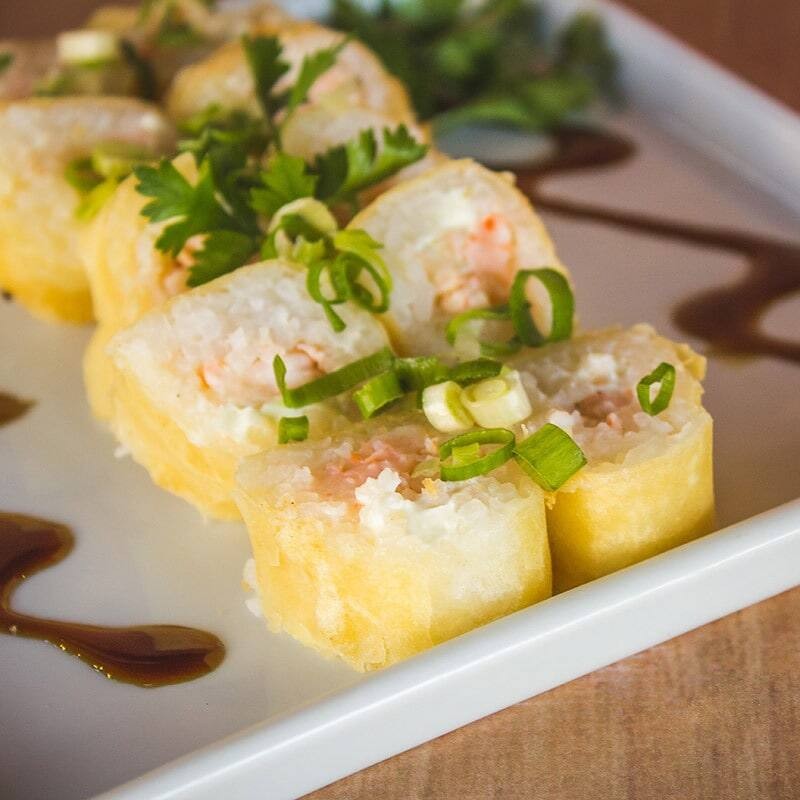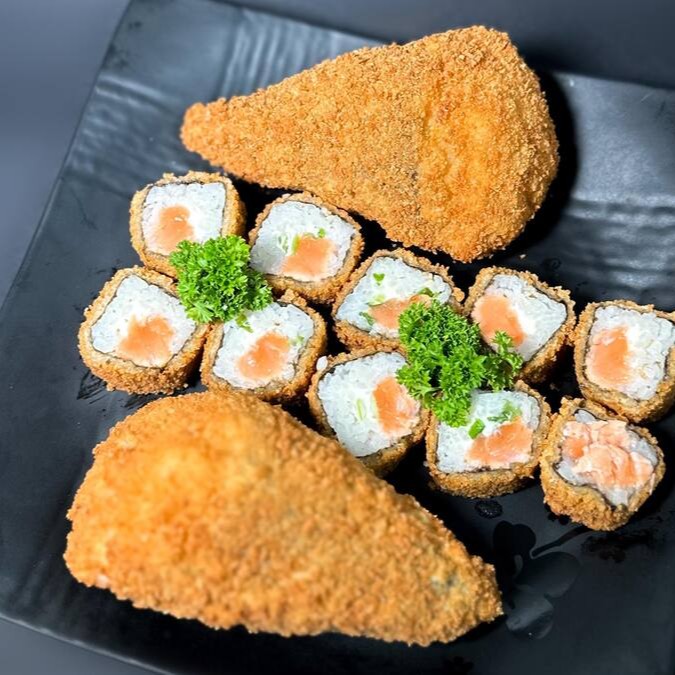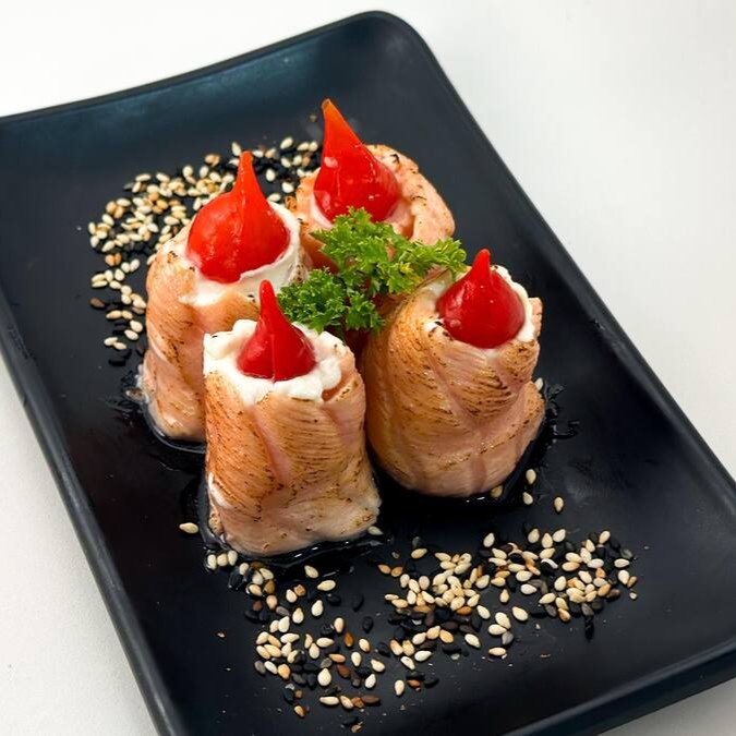 Enrolado de salmão, cream creese, cebolinha empanado e frito com pimenta biquinho
