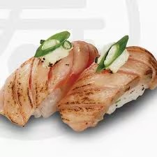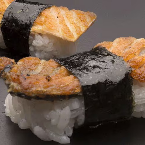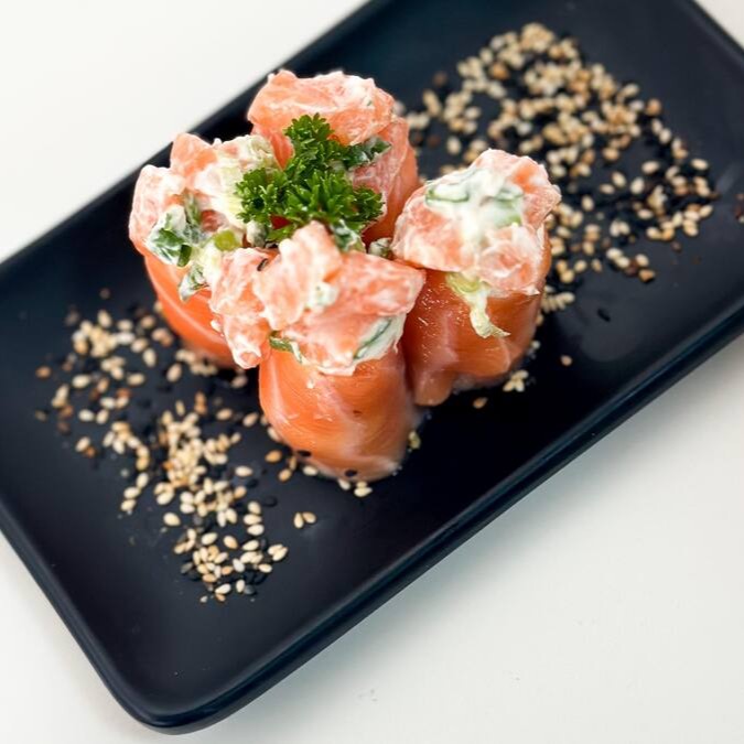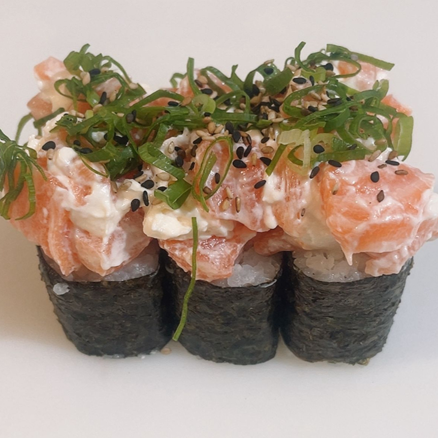 Arroz enrolado no nori com cobertura de salmão picado com cream cheese e cebolinha, por cima.