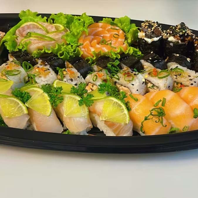 4 joe simples, 8 sashimi salmão, 4 sushi salmão, 10 hot Philadelphia, 16 uramaki Philadelphia.